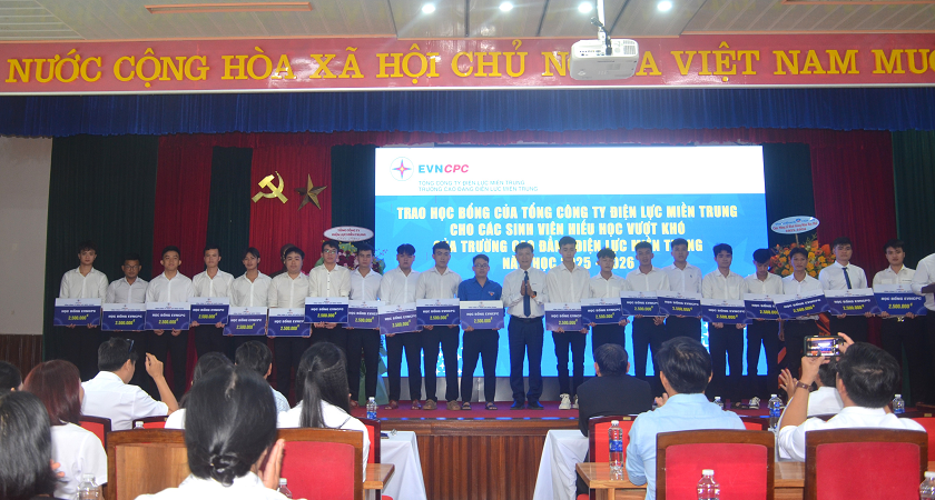 Ông Nguyễn Hữu Khánh – Phó Tổng giám đốc Tổng công ty Điện lực miền Trung (EVNCPC) trao học bổng cho sinh viên